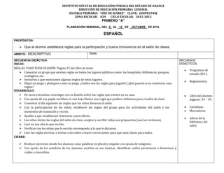 Este documento presenta la planeación semanal de las asignaturas de español, matemáticas y exploración de la naturaleza y la sociedad para el grupo primero "A" de la Escuela Primaria "Año de Juárez" durante la semana del 8 al 12 de octubre de 2012. Los temas a cubrir incluyen reglas de convivencia, números en la vida cotidiana y la identidad personal.