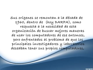 La Internet tiene sus orígenes en la década de 1960 cuando la Agencia de Proyectos de Investigación Avanzada (DARPA) creó la red ARPANet para facilitar la comunicación entre investigadores y compartir recursos entre computadoras. ARPANet conectó instituciones gubernamentales y universidades, permitiendo a científicos, profesores y estudiantes comunicarse y acceder información de otras organizaciones. La Internet evolucionó a partir de ARPANet para conectar a personas de todo el mundo.