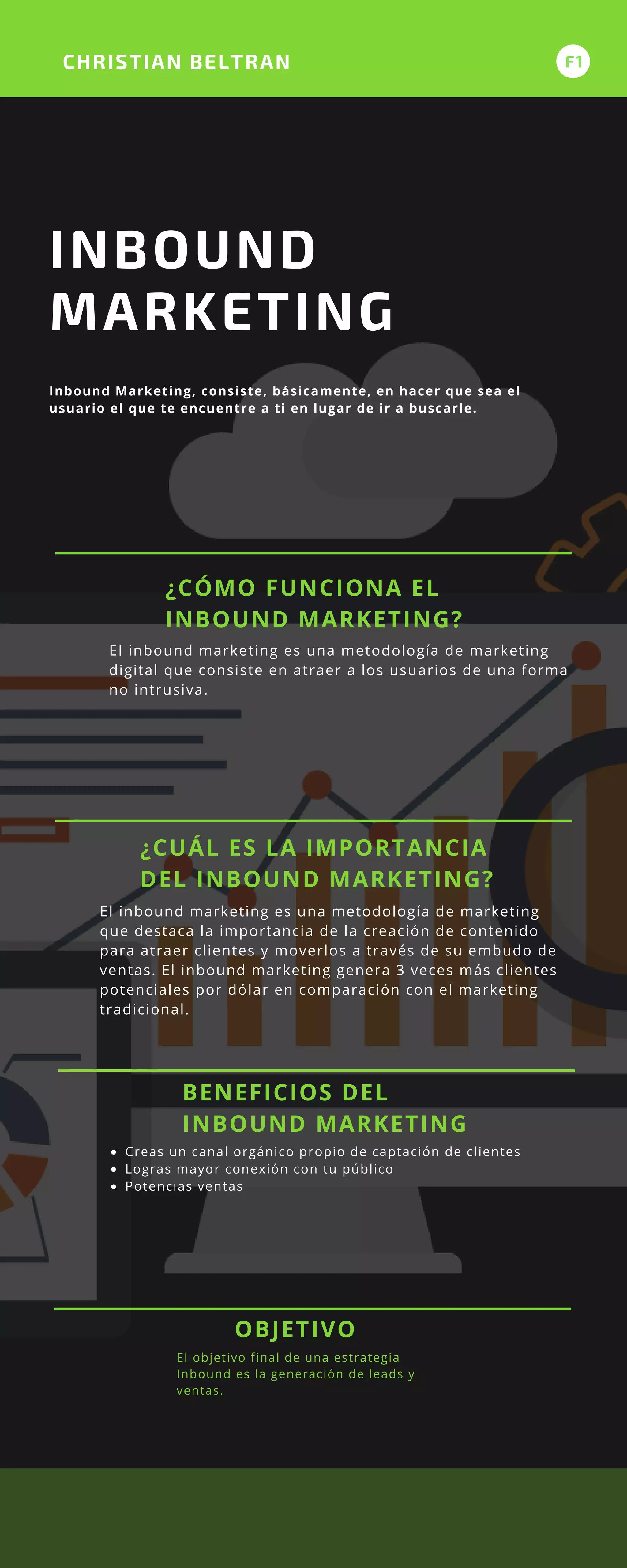 El documento describe el inbound marketing como una metodología de marketing digital que atrae a los usuarios de forma no intrusiva a través de la creación de contenido valioso. El inbound marketing genera tres veces más clientes potenciales por dólar que el marketing tradicional al mover a los clientes a través del embudo de ventas. El objetivo final del inbound marketing es generar leads y ventas.