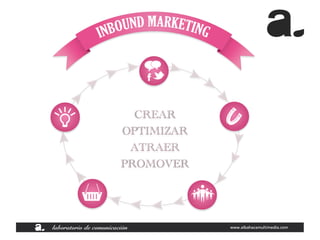 El documento describe el cambio del marketing tradicional al inbound marketing. El inbound marketing consiste en crear contenido atractivo para los usuarios y optimizarlo para que las marcas se posicionen donde los clientes potenciales buscan información. Esto atrae visitantes que luego pueden convertirse en clientes a través de la captación de datos e iniciar un diálogo. El análisis permite optimizar continuamente la estrategia.