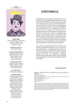 La revista 'Inbox', publicada por estudiantes de la Facultad de Ciencias de la Comunicación de la UNCP, aborda temas variados de comunicación como cine, música, y arte, con un enfoque en la redacción periodística. Este número incluye artículos sobre la vida y obra del artista urbano Daniel Cortez y analiza la evolución del tatuaje como forma de expresión artística. La revista refleja el trabajo arduo de los estudiantes y su deseo de compartir conocimientos y experiencias con los lectores.