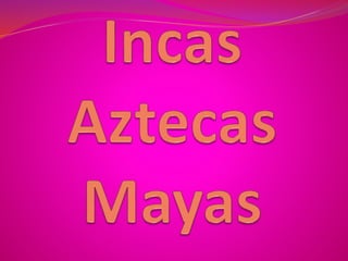 Los incas formaron el imperio del Tahuantinsuyo en América del Sur con capital en Cusco. Su sociedad estaba estratificada y su economía se basaba en la agricultura y el comercio. Otras civilizaciones incluyeron los aztecas, que formaron un imperio en México central con capital en Tenochtitlán, y los mayas en Centroamérica, que desarrollaron ciudades-estado independientes unidas por la cultura.