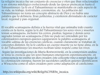 La religión inca estaba basada en una mitología politeísta que evolucionó de creencias preincaicas. Adoraban a diversas deidades locales, regionales y pan-regionales. Creían que todas las cosas vivas y no vivas tenían una "fuerza vital" llamada "camaquen" que los animaba. Consideraban a los emperadores incas como descendientes del dios Sol y los adoraban como divinidades. La religión dominaba la estructura política y se manifestaba en festividades, ceremonias y prácticas como sacrificios y consultas de oráculos.