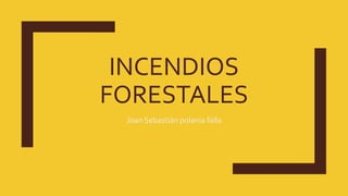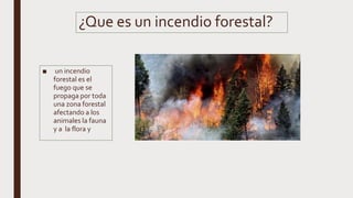 Un incendio forestal es un fuego que se propaga por una zona forestal afectando a la flora y fauna. Pueden ser causados por factores naturales como altas temperaturas o rayos, o por acciones humanas como negligencias o pirómanos. Los incendios forestales tienen graves consecuencias como la pérdida de biodiversidad, daños al suelo, agua y atmósfera, y considerables pérdidas económicas. Es importante adoptar medidas preventivas como no arrojar cigarrillos encendidos o hacer fogatas para evitar incendios