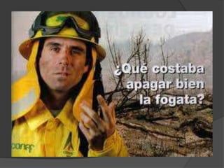 Este documento habla sobre incendios forestales. Define un incendio forestal y explica que las causas más comunes son la sequía prolongada combinada con altas temperaturas y vientos. Las causas pueden ser naturales, accidentales o intencionales. Explica las fases y tipos de incendios, así como estrategias para prevención y extinción.