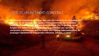 Los incendios forestales generalmente comienzan de manera accidental, ya sea por relámpagos, campistas que dejan fogatas sin apagar o granjeros quemando campos. Se propagan rápidamente quemando arbustos, árboles y casas. La causa más común son acciones humanas como quemas agrícolas que se salen de control, niños jugando con fósforos o descuido con cigarrillos.