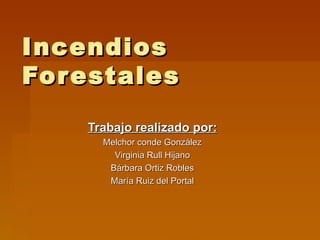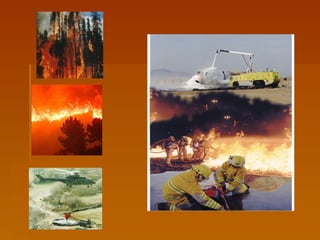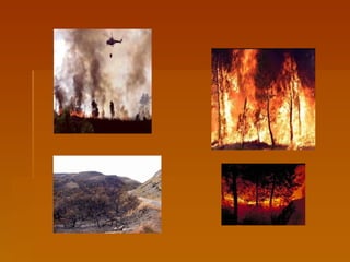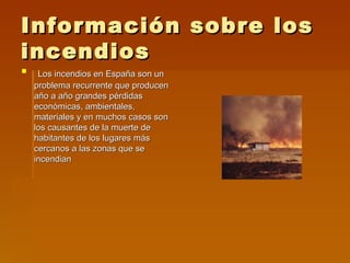 El documento proporciona información sobre los incendios forestales en España, incluyendo los tipos de incendios, sus principales causas, las consecuencias, la prevención y la lucha contra los incendios. Los incendios forestales ocurren anualmente y causan grandes pérdidas. Los tipos de incendios incluyen de superficie, de copas y de subsuelo. Las principales causas son los rayos, la negligencia, causas fortuitas e intencionadas. La prevención y lucha involucra a la Guardia Civil, bomberos