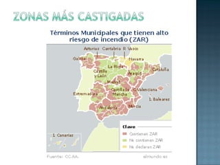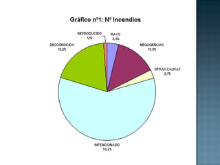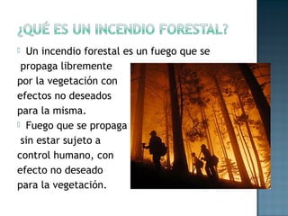Un incendio forestal es un fuego que se propaga sin control por la vegetación de forma no deseada. Pueden ser causados de forma natural por rayos, erupciones volcánicas u otros factores, o provocados por el hombre de forma intencionada o accidental. Los incendios forestales pueden tener efectos negativos como la pérdida de flora y fauna, erosión e incremento de emisiones de CO2.