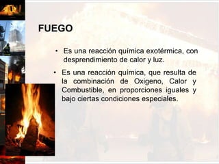 El documento aborda los principios fundamentales del fuego, incluyendo su origen mediante la reacción química de combustibles, oxígeno y calor, y las condiciones necesarias para la combustión. Se describen las clasificaciones de incendios, métodos de extinción, y los diferentes tipos de combustibles y extintores, así como las causas comunes de incendios, enfatizando la importancia de protocolos de seguridad. También se mencionan las teorías sobre la combustión y los métodos de transferencia de calor que afectan la propagación del fuego.