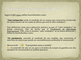 El documento define la incertidumbre como un parámetro asociado al resultado de una medida que caracteriza el intervalo de valores razonablemente atribuibles al mensurando. Explica que la incertidumbre refleja la duda sobre la veracidad del resultado debido a posibles errores, y que puede expresarse cuantitativa o cualitativamente. También introduce el principio de incertidumbre de Heisenberg, el cual establece que es imposible medir simultáneamente con precisión la posición y movimiento de una partícula.
