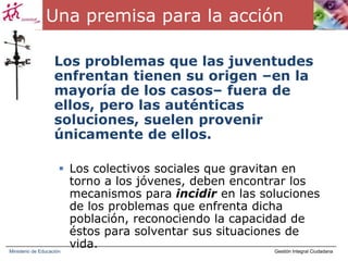 Este documento describe estrategias para abordar problemas entre jóvenes desde una perspectiva de incidencia ciudadana. Propone que los adultos incidan para que los jóvenes puedan decidir por sí mismos, formando comités, redes juveniles y aplicando programas de educación, arte, deporte y valores que desarrollen las capacidades de los jóvenes. El objetivo es promover el desarrollo integral de la juventud a través de enfoques participativos.
