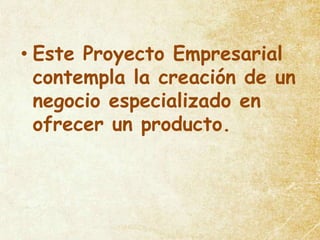 Este documento presenta un proyecto empresarial para crear una microempresa llamada INCIPIENS que se dedicará a la producción, comercialización y distribución de camisas estampadas. Los objetivos incluyen incorporar nuevas técnicas de producción, innovar la presentación del producto y elaborar productos de desarrollo sostenible. La empresa operará en el Centro Comercial Vía Libre en Santa Fe de Bogotá.