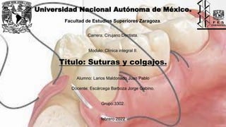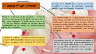 Este documento proporciona una historia de las suturas y colgajos quirúrgicos desde la antigüedad hasta la actualidad. Describe los diferentes materiales, tipos de suturas, diseños de incisiones y colgajos, así como los procedimientos para su levantamiento y sutura. El documento también explica las características de una sutura ideal y los pasos para retirar los puntos quirúrgicos.