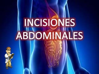 Este documento describe diferentes tipos de incisiones quirúrgicas abdominales. Detalla la ubicación y procedimiento para incisiones altas y bajas en el abdomen derecho e izquierdo, así como una incisione pararrectal. Explica que la incisión de Pfannenstiel causa menos dolor postoperatorio y menor riesgo de hernia que otras incisiones abdominales.