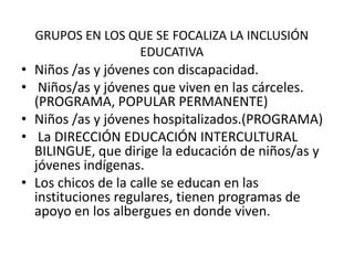 La inclusión educativa busca educar a niños con discapacidades en escuelas regulares, ofreciendo apoyos para que puedan estar en ambientes normales y cumplir los mismos horarios que sus compañeros sin discapacidades. También alienta la amistad entre niños con y sin discapacidades y enseña a todos los niños a aceptar las diferencias. Se enfoca en niños con discapacidad, en prisión, hospitalizados, indígenas y de la calle.