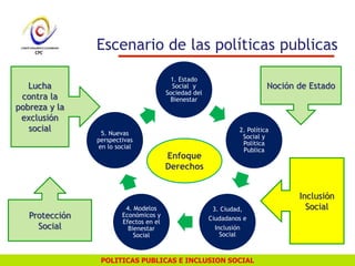 Este documento resume las políticas públicas e inclusión social. Explora conceptos como estado de bienestar, política social, ciudadanía e inclusión. También analiza modelos económicos y sus efectos en el bienestar social. Finalmente, examina nuevas perspectivas como los enfoques basados en derechos para lograr mayor equidad e inclusión a través de las políticas públicas.