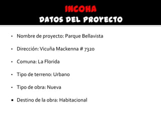 Este documento describe un proyecto inmobiliario llamado Parque Bellavista en La Florida, Chile. El proyecto consiste en la construcción de dos torres de 10 pisos con departamentos y estacionamientos. El proyecto apunta a sectores sociales medios y altos, con valores entre 1,500 y 2,500 UF. El análisis incluye detalles sobre la ubicación, demanda, competencia, costos, flujo de caja y viabilidad del proyecto.