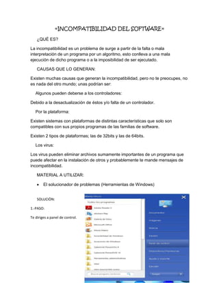 La incompatibilidad de software surge cuando un programa no puede ser ejecutado correctamente debido a problemas con controladores desactualizados, plataformas diferentes o virus. Para resolver problemas de incompatibilidad, se debe usar el solucionador de problemas de Windows siguiendo los pasos de ir al panel de control, buscar el solucionador de problemas, seleccionar programas y hacer clic en la opción para escanear y reparar.