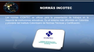 El documento proporciona instrucciones sobre cómo aplicar las normas ICONTEC para la presentación de trabajos académicos en Colombia. Explica que las normas ICONTEC son las más utilizadas en instituciones educativas colombianas y proveen directrices sobre los márgenes, tamaño de papel, interlineado, fuente, y configuración de estilos para títulos, párrafos y número de páginas, así como la inserción de una tabla de contenido automática.