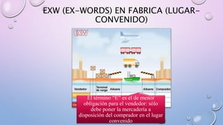 Este documento resume los principales términos de comercio exterior INCOTERMS. El término EXW requiere que el vendedor sólo ponga la mercancía a disposición del comprador en el lugar acordado. Los términos de grupo F requieren que el vendedor entregue la mercancía al medio de transporte contratado por el comprador. Los términos de grupo C requieren que el vendedor contrate el transporte y, en algunos casos, también el seguro. Los términos de grupo D requieren que el vendedor asuma toda la respons