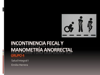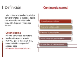 Este documento proporciona información sobre la incontinencia fecal y la manometría anorrectal. Define la incontinencia fecal y sus causas más comunes. Explica que la manometría anorrectal mide las presiones del esfínter interno y externo, así como la sensibilidad y capacidad rectal, para diagnosticar la incontinencia fecal. Finalmente, resume las alternativas terapéuticas como medidas generales, tratamiento farmacológico, quirúrgico y biofeedback.