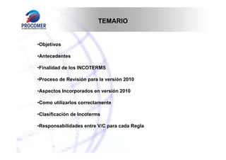 El documento presenta una introducción a los Incoterms 2010, incluyendo sus objetivos, antecedentes, proceso de revisión y aspectos incorporados en la versión 2010. Resume las 11 reglas Incoterms 2010 agrupadas en 4 categorías según las obligaciones de cada parte. Explica cómo utilizar correctamente los Incoterms en los contratos de compraventa internacional para definir claramente las responsabilidades entre comprador y vendedor.