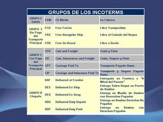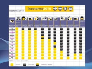 Este documento define el comercio internacional y los contratos de compraventa internacional. También explica los Incoterms®, que son reglas para la interpretación de términos comerciales internacionales. Los Incoterms® 2010 dividen los términos en grupos para transporte marítimo e intermodal y describen las obligaciones de los compradores y vendedores.