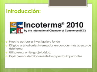 El documento explora los incoterms, o términos internacionales de comercio, que regulan las obligaciones entre compradores y vendedores en el comercio internacional. Se aborda su historia, funciones, y los grupos de contratos que existen, además de las obligaciones específicas de cada parte. La investigación destaca la importancia de estar informado sobre estos términos para evitar malentendidos y facilitar las transacciones comerciales.