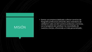 INC.PHOTOGRAPHY es una empresa dedicada a ofrecer servicios fotográficos profesionales utilizando altos estándares de calidad y un trato personalizado para satisfacer las necesidades de los clientes. Su misión es ser la empresa líder en fotografía profesional a nivel nacional ofreciendo amplios servicios e innovación tecnológica. Sus valores incluyen el compromiso con los clientes, eficiencia, respeto y pasión por su trabajo.