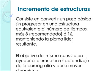 El documento explica cómo incrementar estructuras en coreografías de aeróbicos y step mediante la progresión de pasos básicos simples a estructuras más complejas de 8 o 16 tiempos. Esto ayuda a los alumnos a aprender la coreografía y le da más dinamismo. Se dan ejemplos de cómo incrementar estructuras de 1 básico, 1 mambo o 1 doble mambo a pasos más complejos manteniendo la pierna líder. Esto permite incluir combinaciones más largas y compensar la carga entre piernas en coreografías asimé