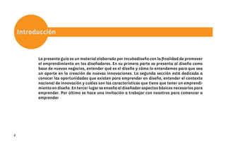 Este documento presenta una guía para promover el emprendimiento en diseñadores. Explica que el diseño puede ser la base para nuevos negocios e innovaciones al agregar valor y resolver necesidades. Identifica oportunidades en sectores como alimentos, turismo y minería. Ofrece consejos sobre cómo emprender, incluyendo tener una actitud emprendedora, un proyecto de diseño viable y un plan de negocio. Finalmente, invita a los diseñadores a trabajar con Incubadiseño para comenzar a emprender.