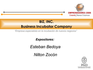 El documento presenta una propuesta de negocio para una incubadora de empresas llamada BIZ, INC. Explica que las incubadoras proveen fondos y asesoría a emprendedores para aumentar las probabilidades de éxito de sus negocios. Luego describe la oportunidad de negocio en Perú, donde muchos emprendimientos fracasan por falta de profesionalización, asesoría y acceso a capital. Finalmente, detalla el modelo de negocio de BIZ, INC., que involucra la búsqueda de emprendedores, constitución de neg
