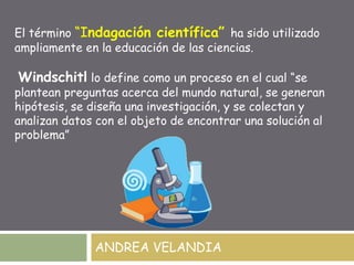 El documento define la indagación científica como un proceso que involucra plantear preguntas sobre el mundo natural, generar hipótesis, diseñar una investigación para recolectar y analizar datos, y encontrar una solución al problema. El proceso implica preguntar, planificar y conducir investigaciones, usar herramientas tecnológicas y científicas para observar y recoger datos, y pensar críticamente para formular explicaciones basadas en la evidencia.