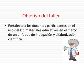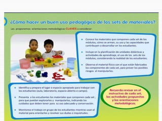 Este documento presenta estrategias para la enseñanza de las ciencias a partir del uso de materiales educativos. Propone abandonar los métodos de enseñanza tradicionales y adoptar estrategias basadas en la indagación científica. Describe actividades prácticas con materiales que permiten desarrollar capacidades como la indagación, el análisis de datos y la comunicación de resultados. Finalmente, ofrece indicaciones sobre el uso pedagógico de los materiales en educación inicial, primaria y secundaria.