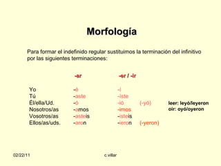 Este documento explica la formación y uso del pretérito indefinido en español. Explica que para formar el indefinido regular se reemplaza la terminación del infinitivo por otras terminaciones según la persona. Proporciona ejemplos de verbos regulares como hablar, comer y vivir. Indica que el indefinido se usa para contar hechos pasados terminados y sin relación con el presente, y recomienda revisar el capítulo 23 de la Gramática Básica del Estudiante de Español para más información.