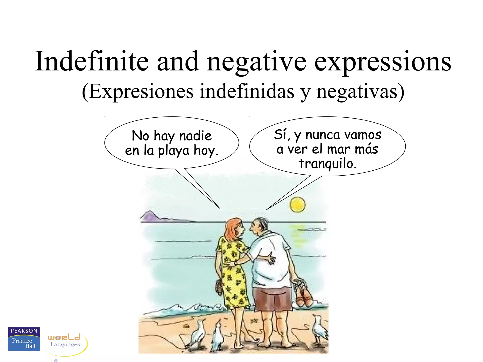 Este documento resume el uso de palabras negativas en español como nada, nadie, nunca, jamás, tampoco, ningún, ninguno y ninguna. Explica que en español, una vez que una oración es negativa, todas las demás palabras indefinidas también son negativas, a diferencia del inglés. También cubre el uso preverbal de estas palabras negativas y las formas afirmativas opuestas a sus contrapartes negativas.