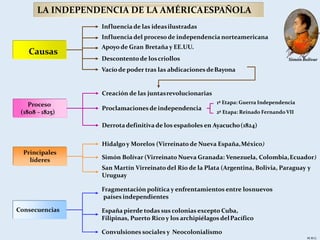 1) La independencia de América Latina se produjo entre 1808 y 1825, liderada por figuras como Simón Bolívar.