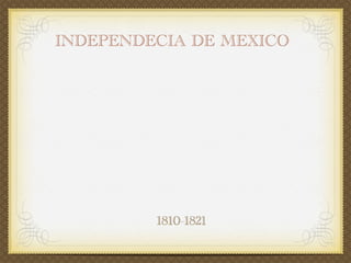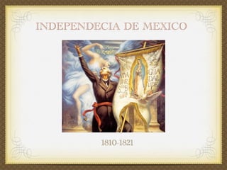 La independencia de México se logró entre 1810 y 1821 luego de 11 años de lucha contra el dominio español. El movimiento comenzó con el Grito de Dolores en 1810 liderado por Miguel Hidalgo y José María Morelos, aunque hubo varios líderes que fueron encarcelados o ejecutados por las fuerzas leales a España. Finalmente, el ejército trigarante encabezado por Vicente Guerrero entró a la Ciudad de México el 27 de septiembre de 1821, poniendo fin a más de 300 años de dominio