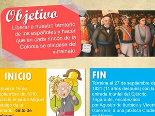 El documento resume las etapas clave de la guerra de independencia de México entre 1810 y 1821. Comenzó con el Grito de Dolores en 1810 liderado por Miguel Hidalgo y finalizó en 1821 con la entrada triunfal del Ejército Trigarante a la Ciudad de México encabezado por Agustín de Iturbide y Vicente Guerrero, declarando la independencia de México. El documento describe las causas internas y externas, los principales líderes como Hidalgo, Morelos y Guerrero, y las distintas etapas