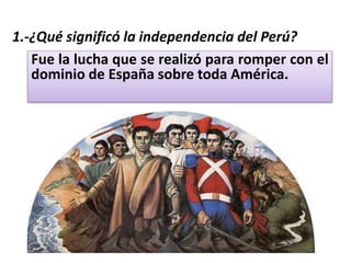 La independencia del Perú significó romper con el dominio español en América. Factores internos como el aumento de impuestos y externos como las reformas borbónicas y la independencia de las 13 colonias contribuyeron. El general José de San Martín lideró la campaña para liberar Perú desde Argentina. En 1820 desembarcó en Paracas y estableció su cuartel general. Más tarde proclamó la independencia del Perú el 28 de julio.