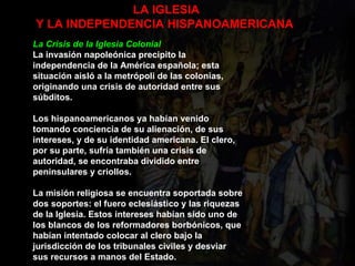 1) La independencia de Hispanoamérica debilitó a la Iglesia colonial al dividir al alto y bajo clero y privarla de recursos económicos. 2) Los obispos en su mayoría permanecieron leales a España, mientras que el bajo clero criollo apoyó los movimientos independentistas. 3) Los líderes independentistas buscaron legitimidad moral no en el pensamiento católico sino en la filosofía ilustrada, aunque Bolívar trató de establecer buenas relaciones con la Iglesia.