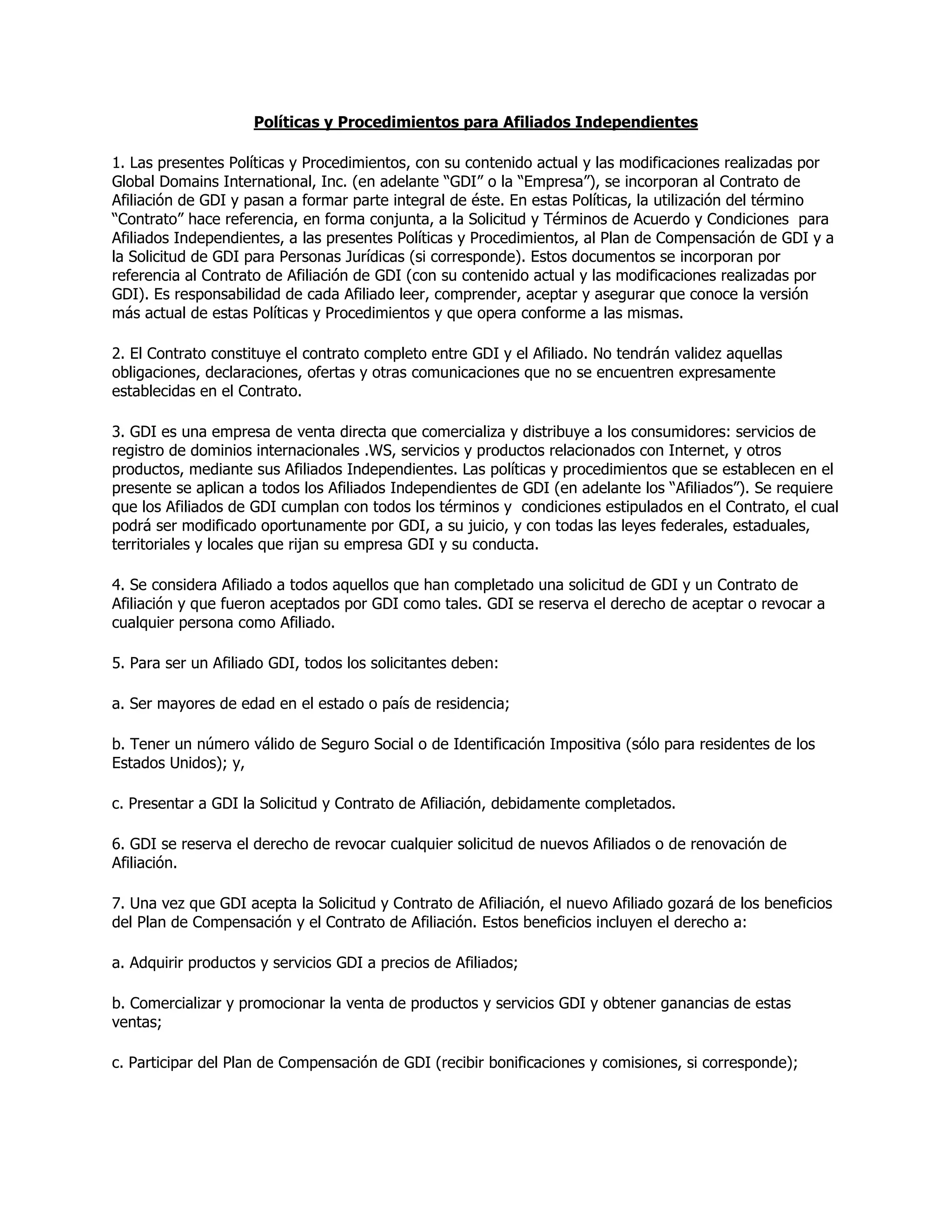 Este documento establece las políticas y procedimientos para afiliados independientes de Global Domains International (GDI). Detalla los requisitos para ser afiliado, incluyendo la presentación de una solicitud y contrato de afiliación. También describe los beneficios de ser afiliado como adquirir productos a precios preferenciales y participar en el plan de compensación. Finalmente, cubre temas como publicidad, propiedad intelectual, impuestos y la relación contractual independiente entre GDI y sus afiliados.