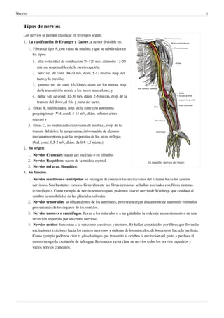Los nervios son manojos de fibras nerviosas que conectan los centros nerviosos con los órganos del cuerpo. Están compuestos de axones cubiertos por tejido conectivo y, en algunos casos, mielina. Los nervios transmiten señales sensoriales hacia el cerebro y órdenes motoras desde el cerebro.