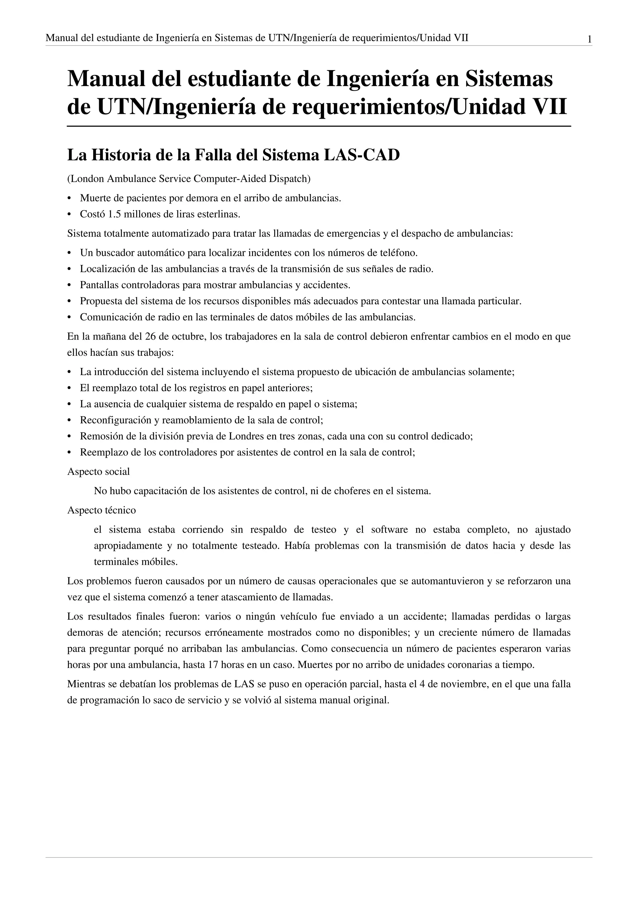 El documento describe el fracaso del sistema LAS-CAD (London Ambulance Service Computer-Aided Dispatch) que resultó en demoras en la atención de emergencias y algunas muertes. El sistema fue implementado sin pruebas adecuadas y el personal no fue capacitado, lo que generó fallas operacionales. El documento también presenta la metodología SSM para el análisis de sistemas, que incluye 7 etapas como examinar la situación, expresarla, seleccionar puntos de vista relevantes, construir modelos conceptuales y comparar