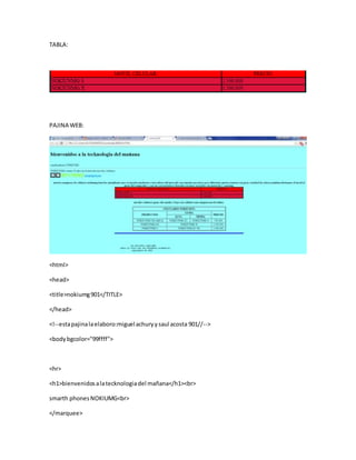 Este documento presenta una página web sobre la empresa Nokiumg, fabricante de teléfonos celulares. La página incluye información sobre los 10 años de Nokiumg en el mercado móvil, logotipos de la empresa, y tablas con modelos de teléfonos de gama alta, media y baja y sus respectivos precios. También menciona asociaciones con Motorola y Samsung.