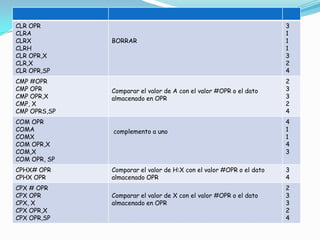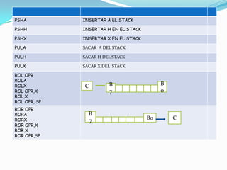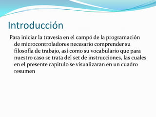 Este documento introduce los conceptos básicos de la programación de microcontroladores, incluyendo los registros de uso general como el acumulador, registro índice, registro de programa y registro de banderas. También explica los diferentes modos de direccionamiento como inmediato, inherente, extendido, directo e indexado con desplazamiento de 8 y 16 bits, los cuales permiten acceder a la memoria de diferentes formas.