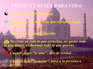 Este documento contiene un poema de la buena suerte del Tantra nepalí y varias instrucciones y consejos de vida. Promete buena suerte al receptor si comparte el mensaje con otros en los próximos 4 días. Incluye consejos como amar apasionadamente pero con cuidado, respetar a los demás, y crear armonía en el hogar.