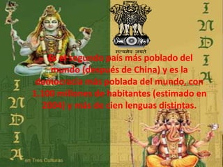 India es el segundo país más poblado del mundo con más de 1,100 millones de habitantes y más de 100 lenguas. Históricamente, los indios originales fueron asimilados por tribus invasoras drávidas. Ubicada en el sur de Asia, limita con Pakistán, Nepal, Bután, China, Sri Lanka y las Maldivas. La India es una unión federal socialista y secular compuesta por estados. El hinduismo es la religión principal, seguida por el islam, el cristianismo, el sijismo y el budismo. La agricultura,