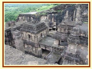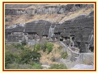 Las Cuevas de Ajanta en India contienen 32 grutas talladas en roca volcánica hace más de 1500 años por artistas desconocidos. Estos artistas crearon pinturas detalladas y esculturas en las cuevas usando solo cinceles y martillos. Algunas cuevas servían como monasterios donde vivían monjes, mientras que otras eran templos similares a catedrales cristianas con estatuas de Buda. Las pinturas y esculturas en las cuevas muestran un alto nivel de perspectiva, profundidad y realismo que