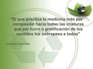 Este documento presenta una introducción a la medicina hindú o ayurveda. Explica que el ayurveda se remonta a 3500 años a.C. y se basa en la creencia de que el cuerpo es cuatripartito: físico, energético, mental y espiritual. Describe algunos de los principales métodos de diagnóstico y tratamientos del ayurveda como el masaje, el análisis de orina y las drogas vegetales, animales y minerales. También resume las ocho disciplinas principales de la medicina ayurved